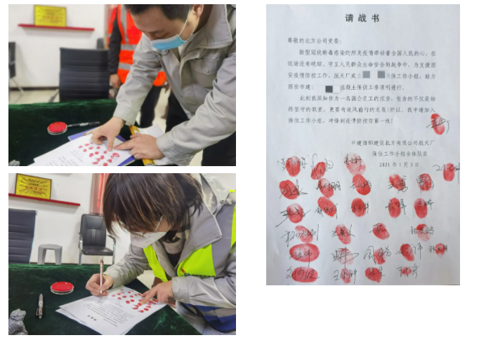 接到供應任務后,航天廠聞令而動,連夜組織所在社區(qū)非管控區(qū)域的居家辦公人員返崗待命,2小時完成全員核酸檢測工作、8個小時集中全部骨干力量,開啟了北方公司“砼心抗疫”的重要使命。動員會上,28名參戰(zhàn)人員以宣誓、簽署請戰(zhàn)書的方式表達了招之則來,來則必勝的抗疫信念。