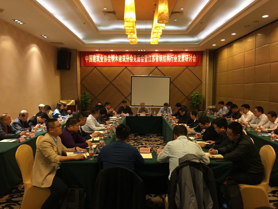2020年10月14日至15日,由中國建筑業(yè)協(xié)會鋼木建筑分會、江蘇省建筑鋼結(jié)構(gòu)混凝土協(xié)會與江蘇省建筑業(yè)協(xié)會共同主辦,江蘇新藍(lán)天鋼結(jié)構(gòu)有限公司承辦的江蘇省鋼結(jié)構(gòu)行業(yè)發(fā)展研討會在南京召開。中國建筑業(yè)協(xié)會鋼木建筑分會高級顧問劉哲、常務(wù)副會長黨保衛(wèi)、副秘書長劉民,江蘇省建筑業(yè)協(xié)會常務(wù)副會長紀(jì)迅,江蘇省建筑鋼結(jié)構(gòu)混凝土協(xié)會常務(wù)副會長兼秘書長曹平周,江蘇省建筑行業(yè)協(xié)會建筑產(chǎn)業(yè)現(xiàn)代化工作委員會副秘書長袁宏波,南京工業(yè)大學(xué)木結(jié)構(gòu)設(shè)計院院長程小武,江蘇省建筑鋼結(jié)構(gòu)混凝土協(xié)會副會長單位江蘇新藍(lán)天鋼結(jié)構(gòu)有限公司董事長陳忠榮等27家鋼結(jié)構(gòu)設(shè)計、施工、涂裝企業(yè)共40余人出席了本次會議。