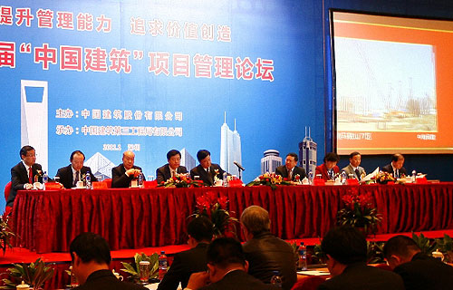 2011年1月6日至7日,由中國建筑股份有限公司組織的以“提升管理能力,追求價值創(chuàng)造”為主題的第二屆“中國建筑”項目管理論壇在深圳成功舉辦。中國建筑業(yè)協會副會長兼秘書長吳濤,中建總公司董事長、黨組書記易軍,深圳市委常委、常務副市長呂銳鋒,中建股份副總裁王祥明,深圳市住房和建設局副局長胡建文,英國皇家特許建造學會(CIOB)全球主席李世蓉等領導出席了論壇。中國建筑股份公司相關部門、各工程局有關負責人、部分優(yōu)秀項目經理等近200人參加了論壇。