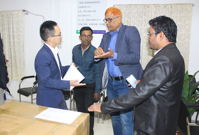 孟加拉N8改擴(kuò)建項目7標(biāo)負(fù)責(zé)人張奎正與順豐孟加拉辦事處人員咨詢貨物運送細(xì)節(jié)。馬洪強 攝