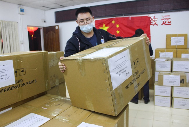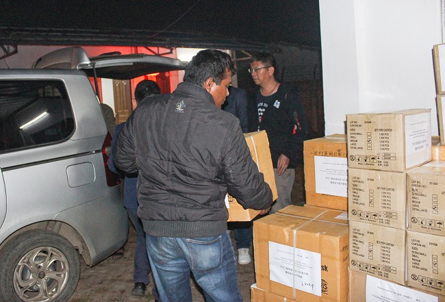 孟加拉N8改擴(kuò)建項目7標(biāo)工作人員搬運準(zhǔn)備支援武漢的醫(yī)療物資 (2) 馬洪強 攝
