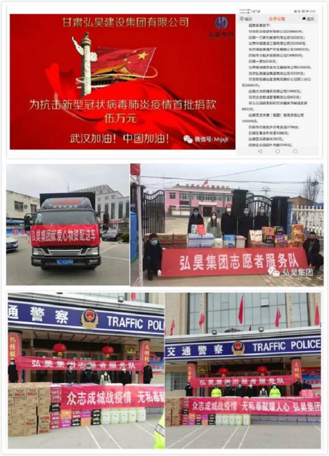 在此期間,全體弘昊人認真履行防疫工作的職責,從小事做起,為本次抗擊疫情貢獻微薄之力。先后承擔了蘭州大學第一醫院西站院區維修改造項目施工任務,積極參加社會公益活動,為抗擊疫情捐款捐物,深入了解員工的出行及健康狀況,一起助力武漢,為中國加油。