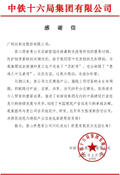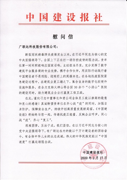 近期,由于在疫情防控期間對(duì)建筑業(yè)同仁的積極努力和大力協(xié)助,廣聯(lián)達(dá)陸續(xù)收到了來(lái)自各方的感謝信,受到中鐵十六局集團(tuán)有限公司和中國(guó)建設(shè)報(bào)社等多家建筑行業(yè)同仁的一致好評(píng)。艱難困苦,玉汝于成,有千萬(wàn)計(jì)建設(shè)者的團(tuán)結(jié)奮斗,有全體中華兒女的眾志成城,偉大的中華民族定能以“中國(guó)速度”打贏這場(chǎng)狙擊戰(zhàn)。