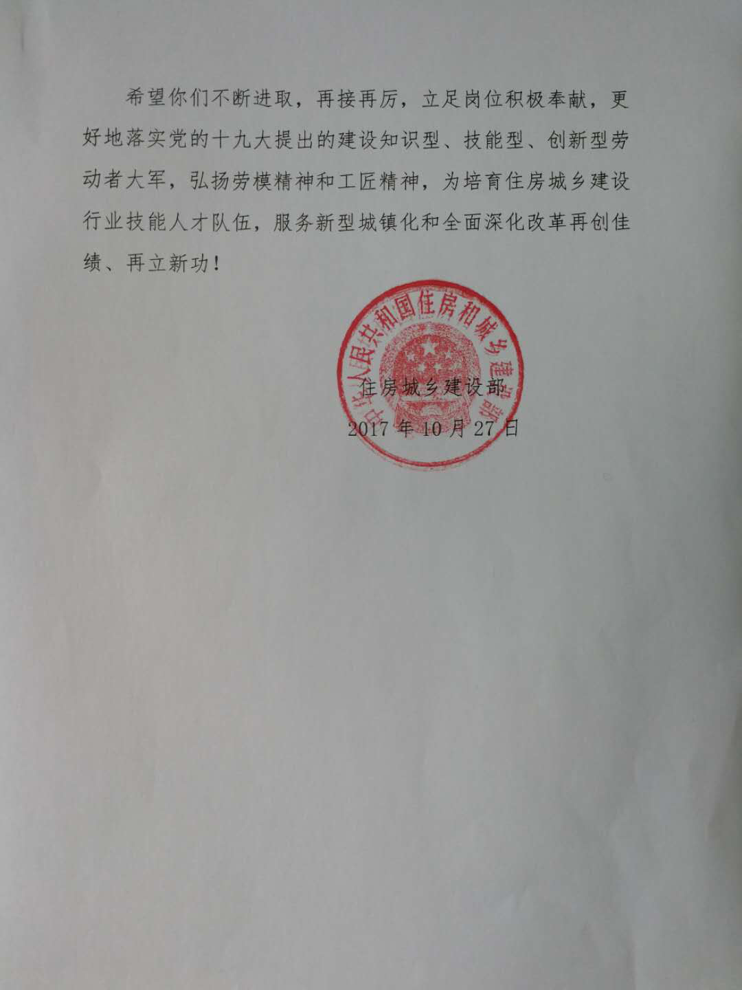 10月27日和25日,住房城鄉建設部部長王蒙徽、副部長易軍分別就部人事司關于第44屆世界技能大賽,我們中國建筑業協會建筑企業經營和勞務管理分會在部人事司指導下組織選拔、集訓選派的建設行業選手參賽情況的簽報上作出批示,并以住房城鄉建設部名義向我會及獲獎選手、專家、教練團隊、集訓基地、選手所在單位發來賀信。賀信全文如下: